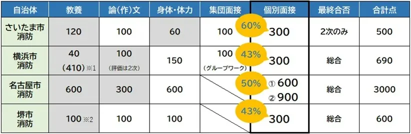 全ての消防官採用試験で口述試験(個別面接)や体力検査が課されます。2次試験の配点比率は、どの自治体でも高まる傾向にあります。1次試験を通過してから、2次試験の対策を始めるというスケジュールでは間に合わない受験生が多くなってきているのも事実です。したがって、早い段階から筆記試験対策と並行して人物試験のための用意をしておく必要があります。