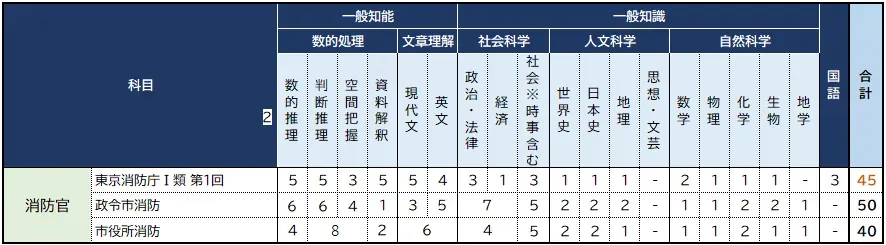 - 令和4年度までの筆記試験では、他の自治体と比べて自然科学の出題数が多く10問程度出題されていました。したがって、これまで東京消防庁を志望する受験生は、数的処理・文章理解・自然科学を重点的に対策する必要があったのです。