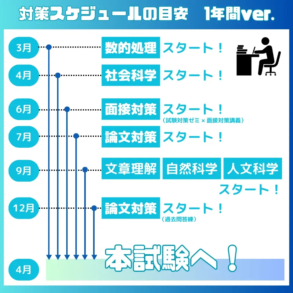 1年間を目安に、逆算されたスケジュールで筆記試験を効率的に攻略し、難関の人物試験を勝ち抜くための人間力を磨いていきましょう!